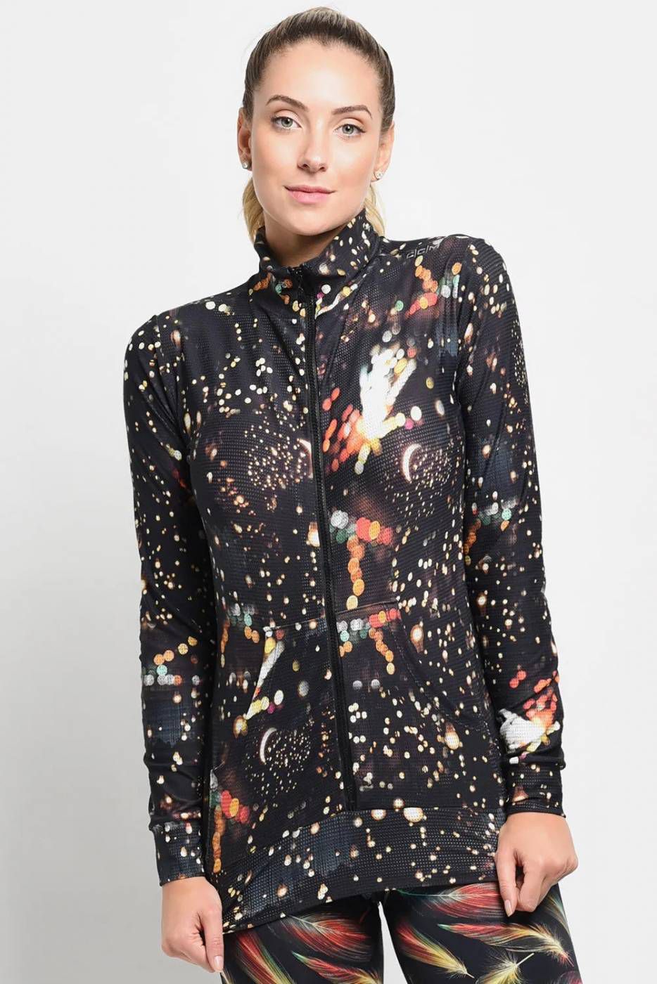 Casaco de manga longa, gola alta e fecho de zíper na frente com pala grossa no cós. Tecido de tela macia e confortável com elasticidade e permeabilidade ao suor, ideal para prática de atividades físicas e para o dia a dia.